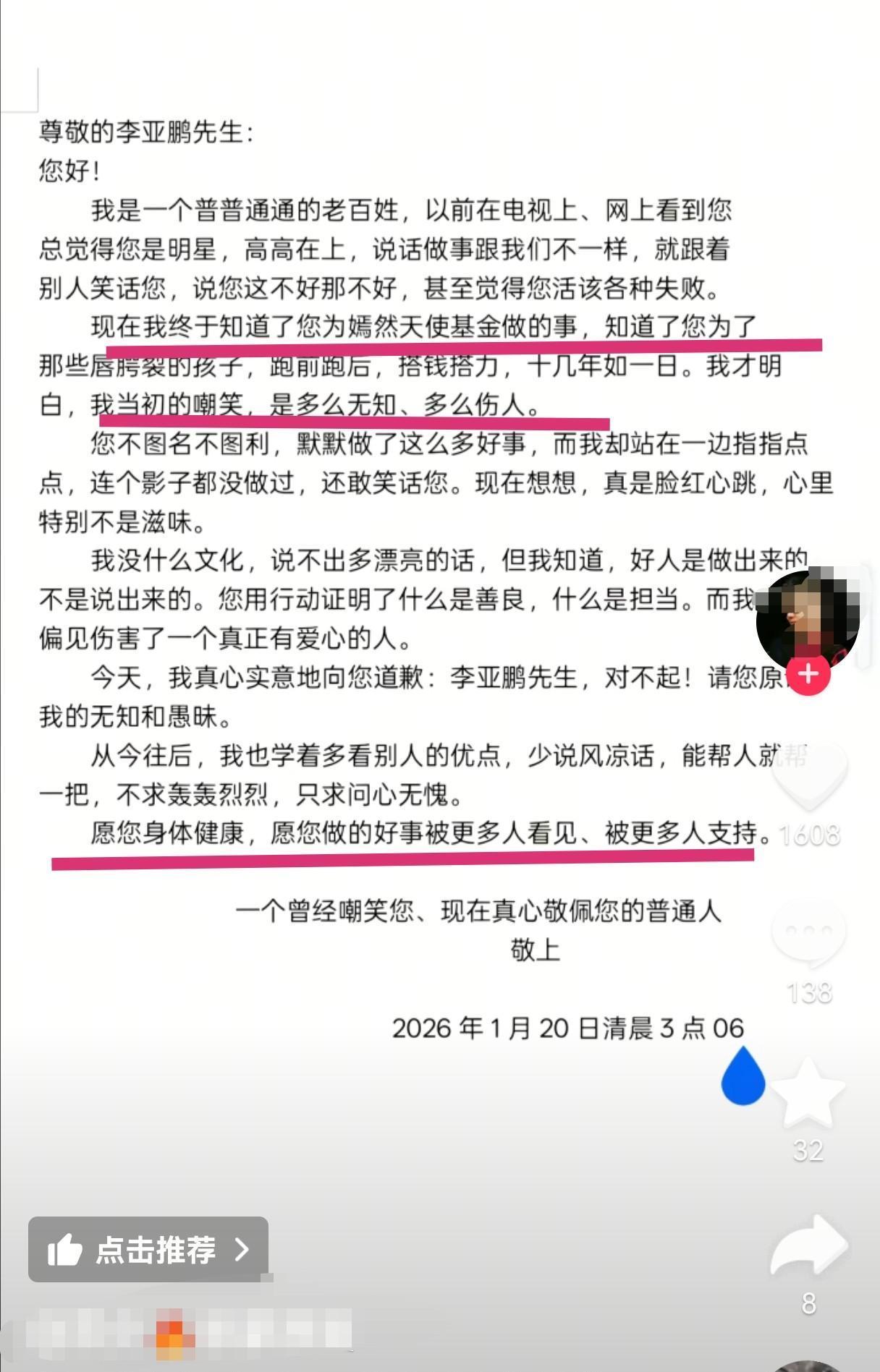 这几天,李亚鹏突然又火了,但这次不是因为啥负面新闻,反而是因为“黑料”翻红,挺魔幻的。很多人以前对他印象不好,现在却纷纷站出来替他说话——被他帮助过的病患、前员工、街坊邻居,甚至素不相识的网友,都开始重新打量这个人。