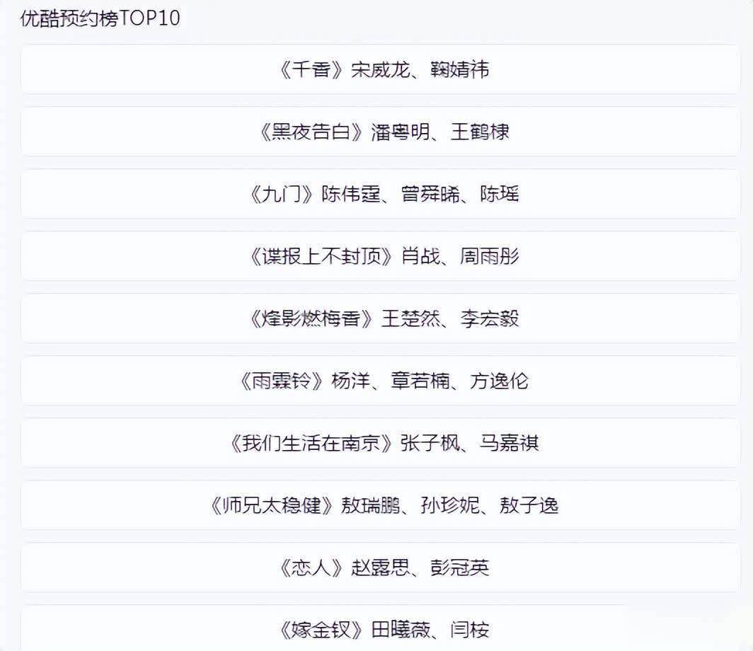 小编看到了爱优腾待播剧的TOP10,都是好剧呀,不知道小伙伴们喜欢哪部剧呢?爱奇艺期待榜TOP10,任嘉伦《佳偶天成》位列第一;张凌赫、王楚然《这一秒过火》排第二,杨紫《家业》位列第三;在优酷预约榜TOP10中,宋威龙、鞠婧祎《千香》登顶,潘粤明、王鹤棣《黑夜告白》排第二,肖战《谍报上不封顶》,杨洋《雨霖铃》在榜;在腾讯期待榜TOP10中,《佳偶天成》位列第一,《这一秒过火》排第三配资平台最新消息,《莫离》、《尚公主》、《百花杀》、《长风起》在榜,你们期待谁呢?